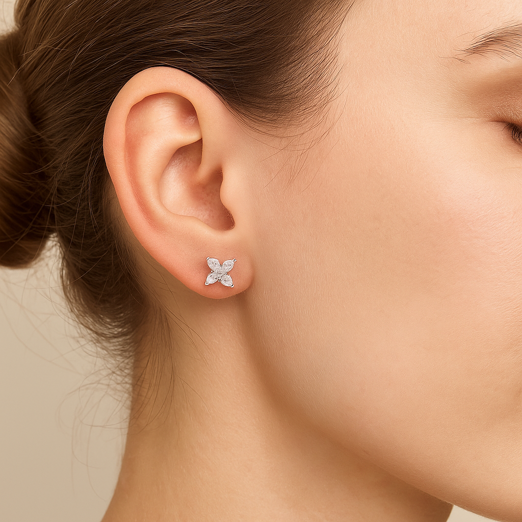 Studs estilo flora con diamantes lab grown corte marquise en oro amarillo 14k, que combinan delicadeza y sofisticación en un diseño inspirado en la naturaleza. Con un peso total de 0.75 ctw, estos aretes irradian un brillo elegante y atemporal, ideales para añadir un toque sutil de lujo a cualquier look.