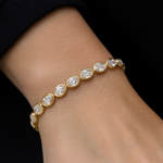 Pulsera tipo tennis con diamantes lab grown corte oval, montados a bisel en orientación east-west en oro amarillo 14k, que capturan la luz en un resplandor elegante y uniforme. Su diseño moderno y atemporal combina sofisticación y sutileza, convirtiendo esta pulsera en un accesorio que ilumina cada movimiento con delicadeza.