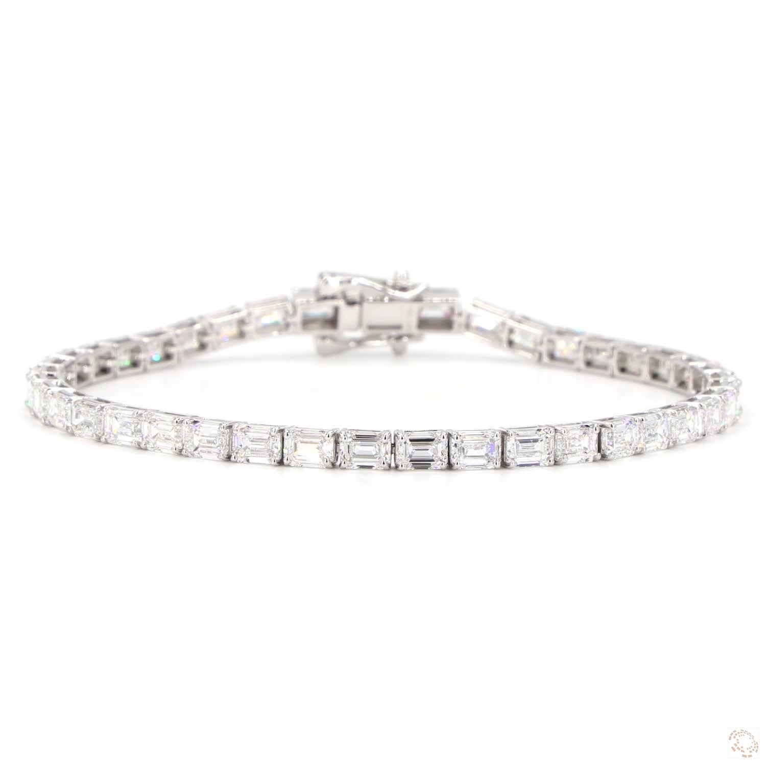 Pulsera tipo tennis con diamantes lab grown corte emerald montados en orientación east-west, que crean un destello de luz continuo y elegante a lo largo de la pieza. Esta pulsera combina sofisticación moderna y atemporalidad, convirtiéndose en un accesorio versátil que realza cualquier estilo con un brillo refinado.