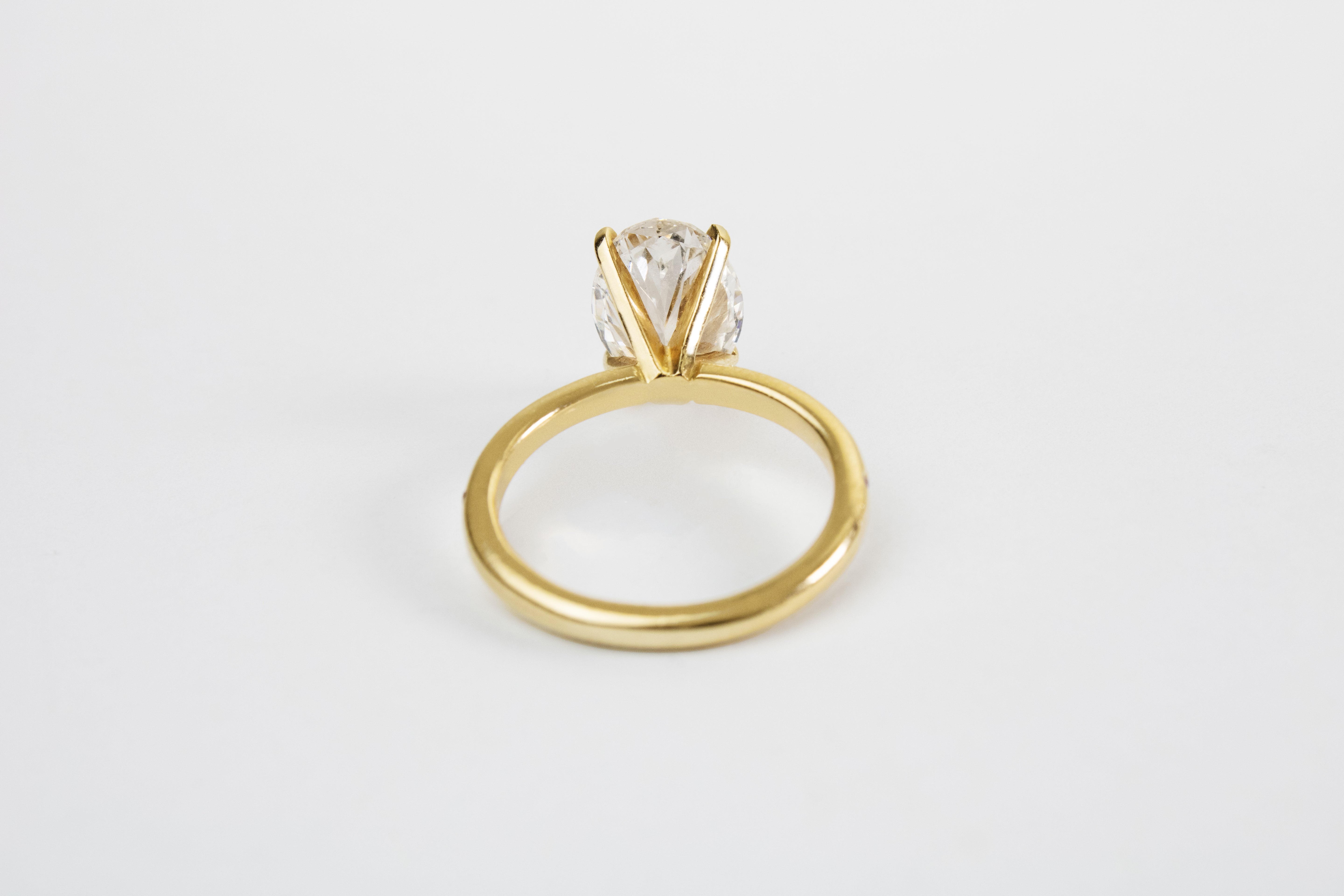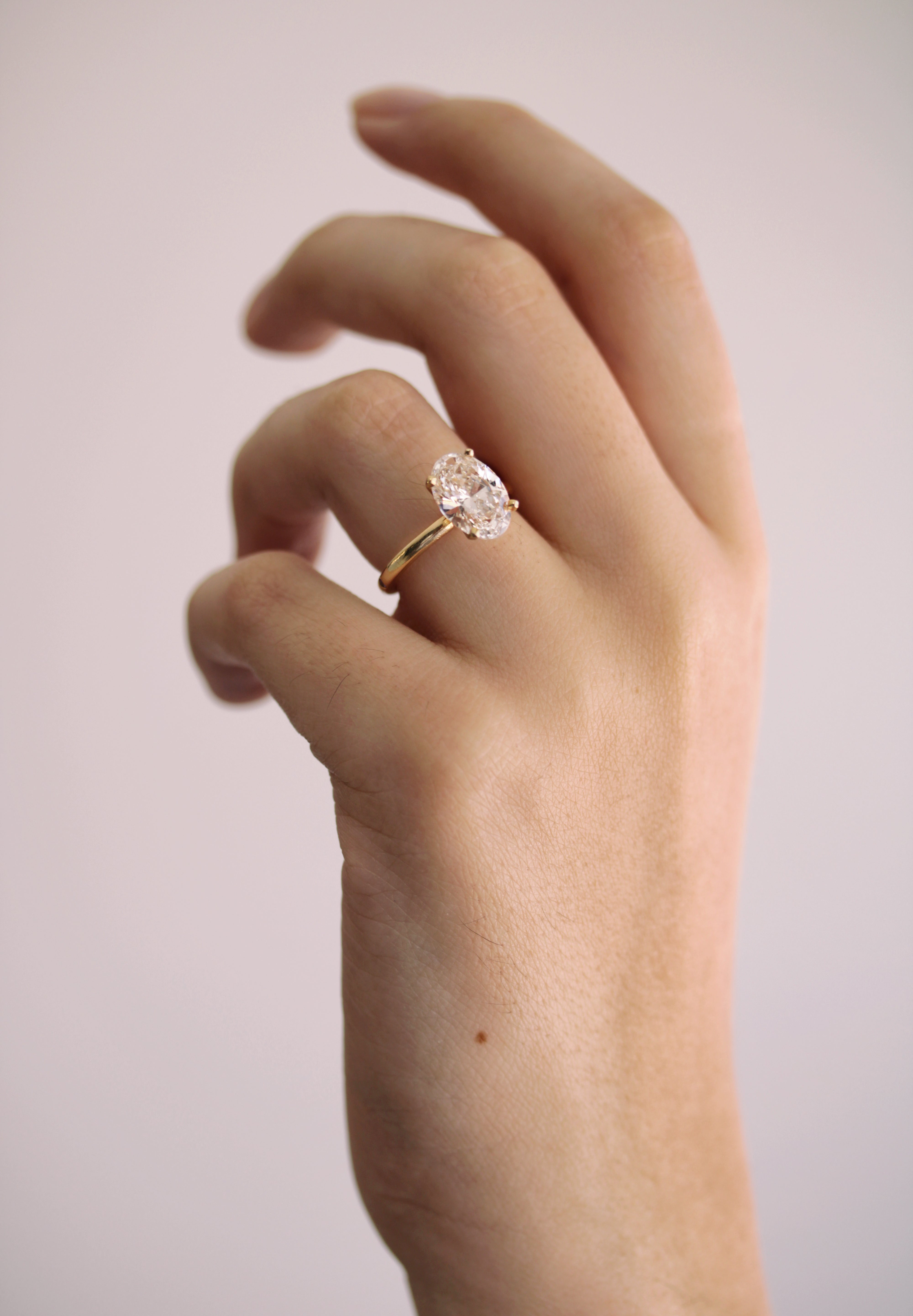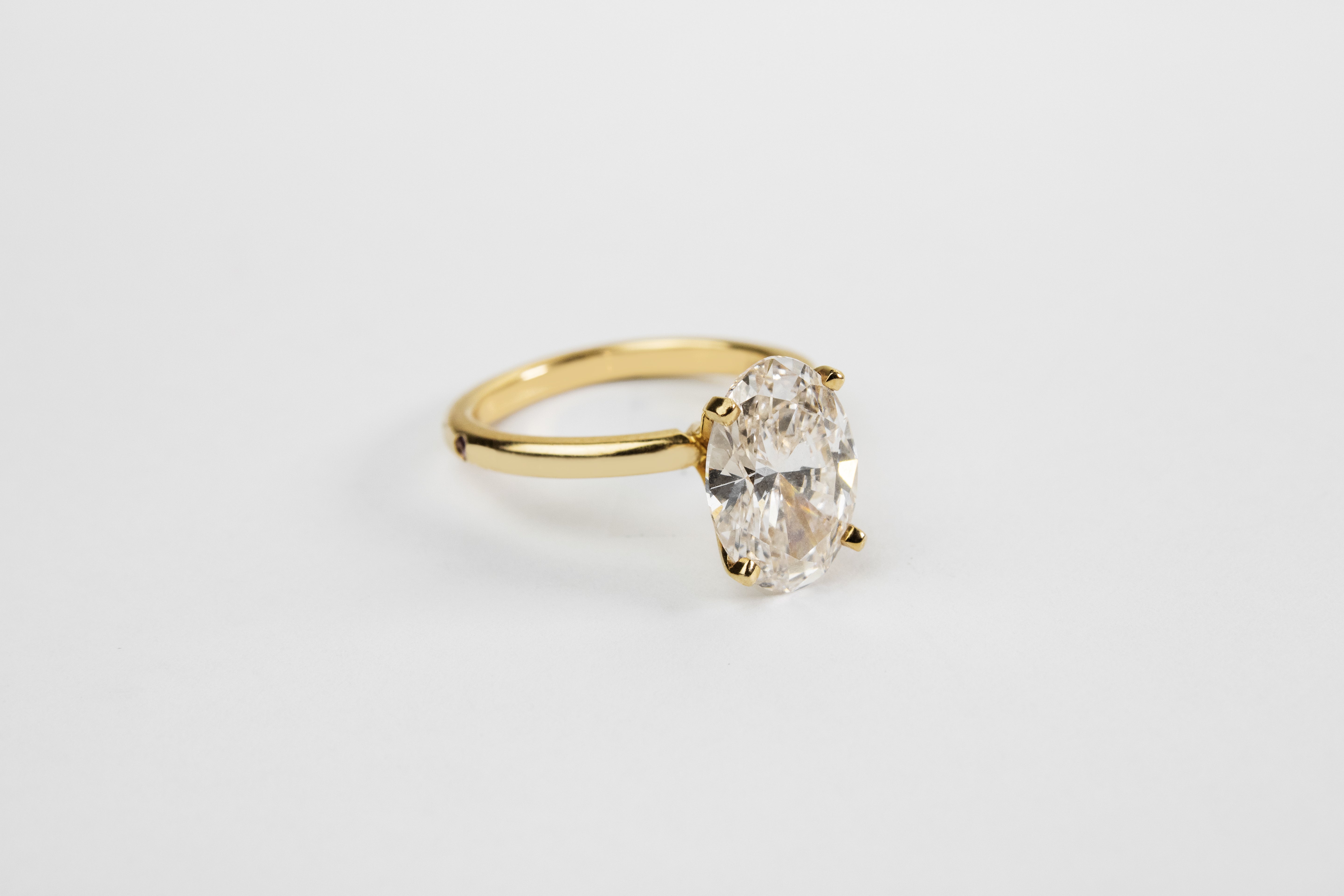 1.8mm 14K yellow gold half-round style ring mounted with a 3 ct Oval cut central diamond and a 0.01 ct round cut hidden purple diamond. Manufacturing time 4 to 6 weeks.