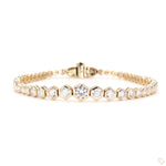Pulsera tipo tennis con diamantes lab grown corte hexagonal, montados a bisel en oro amarillo 14k, que irradian un brillo geométrico y sofisticado a lo largo de la pieza. Su diseño moderno y atemporal combina elegancia y carácter, convirtiendo esta pulsera en un accesorio que resalta con sutileza cada movimiento.