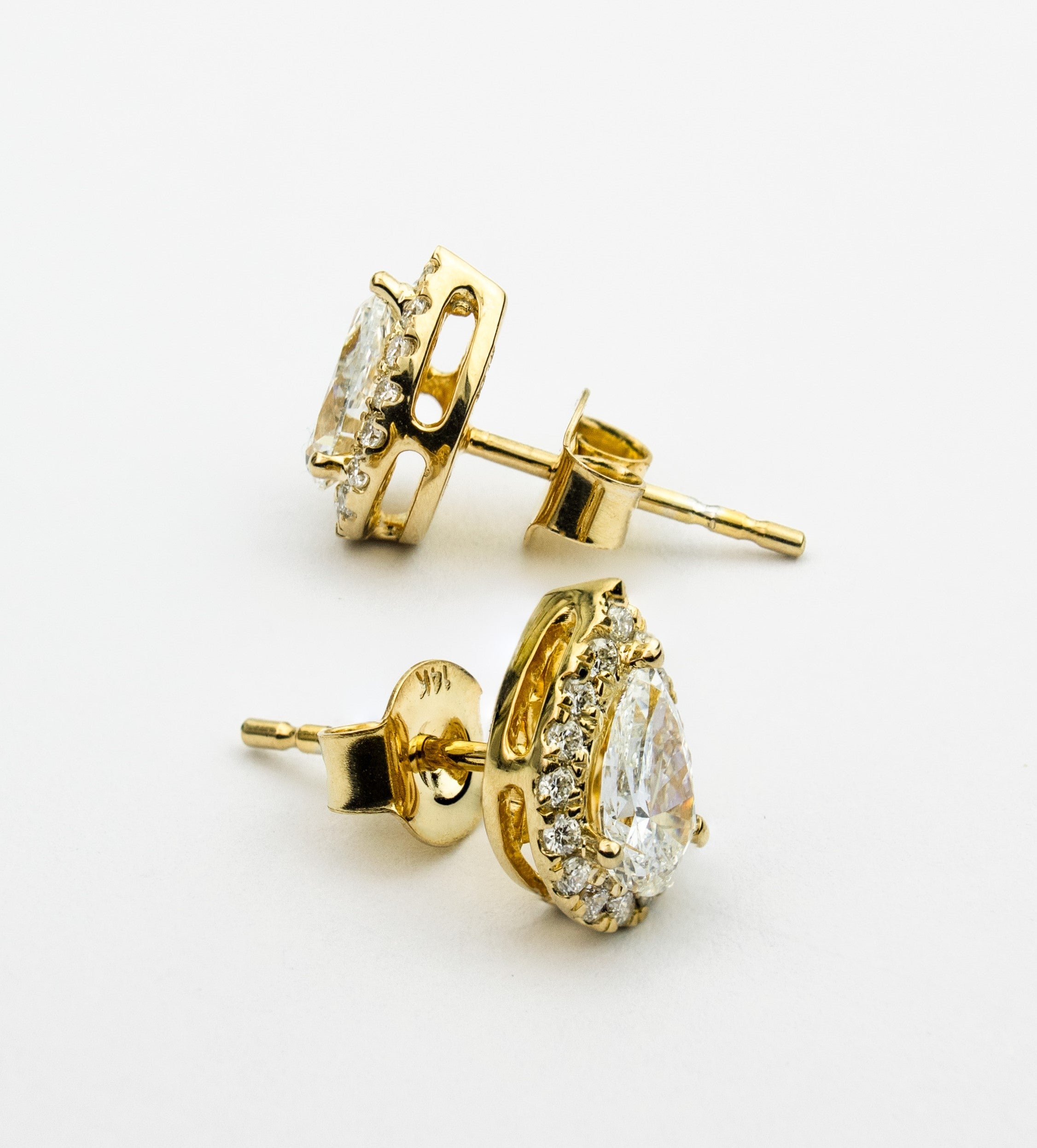 ¡Agrega un toque de elegancia y brillo a tu estilo con nuestros studs en oro amarillo de 14k! Cuentan con un diamante corte pera de 1ctw totales rodeado por un halo de diamantes adicionales.