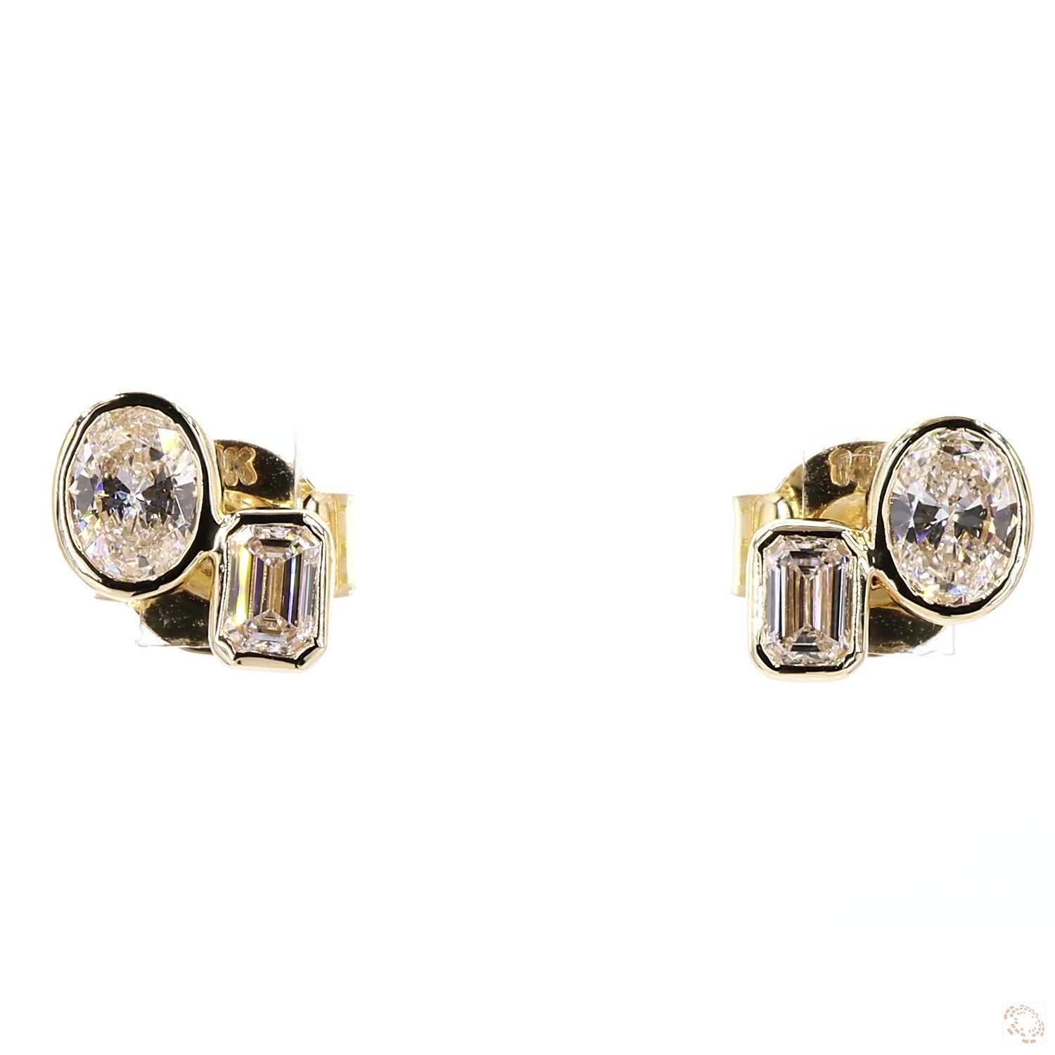 Aretes de doble diamante, corte oval y emerald, montados a bisel en oro amarillo 14k, que capturan la luz desde distintos ángulos con un brillo sofisticado. Con un peso total de 0.50 ctw, estas piezas combinan modernidad y elegancia atemporal, creando un delicado juego de luz que realza cualquier estilo.