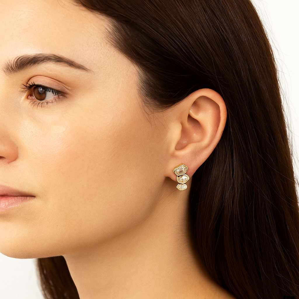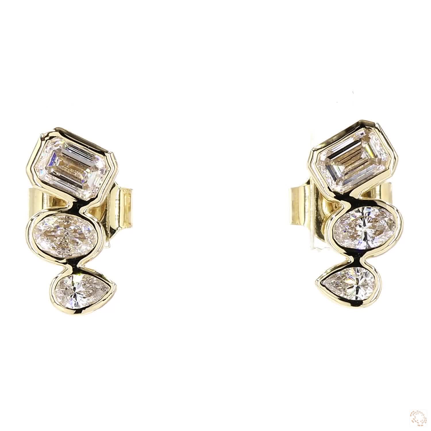 Aretes triple diamante, con cortes emerald, oval y pera, montados a bisel en oro amarillo 14k, que juegan con la luz en un delicado desfile de brillo y elegancia. Con un peso total de 0.75 ctw, estas piezas combinan sofisticación moderna y atemporalidad, creando un efecto luminoso que realza cada movimiento.