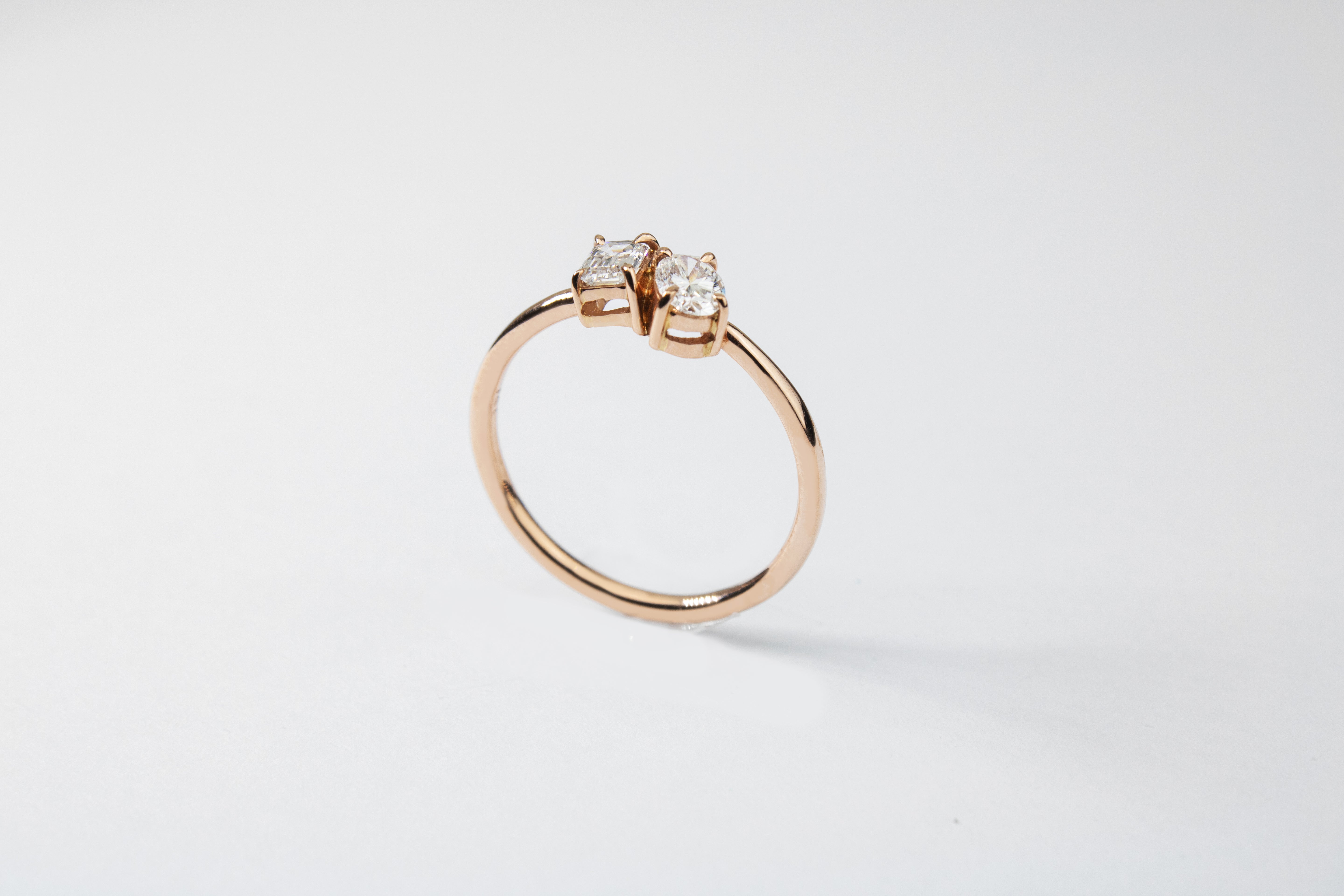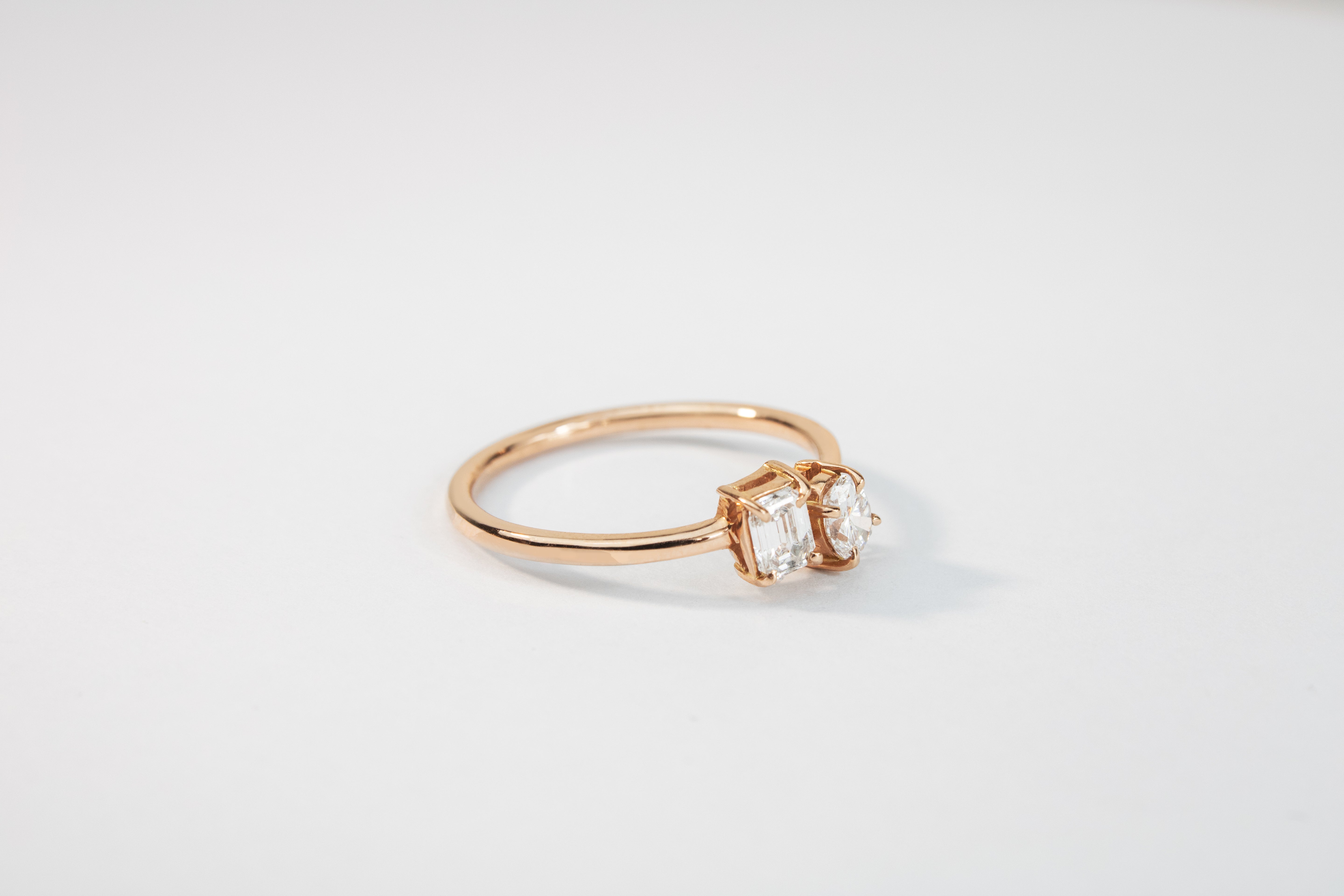 El anillo Tú y Yo representa la unión de una madre y su hijo que reflejan su amor incondicional y brillan mutuamente a través de la conexión inquebrantable que los une. Un diamante Emerald de 0.24 quilates y un Oval de 0.25 quilates en oro rosa de 14K.