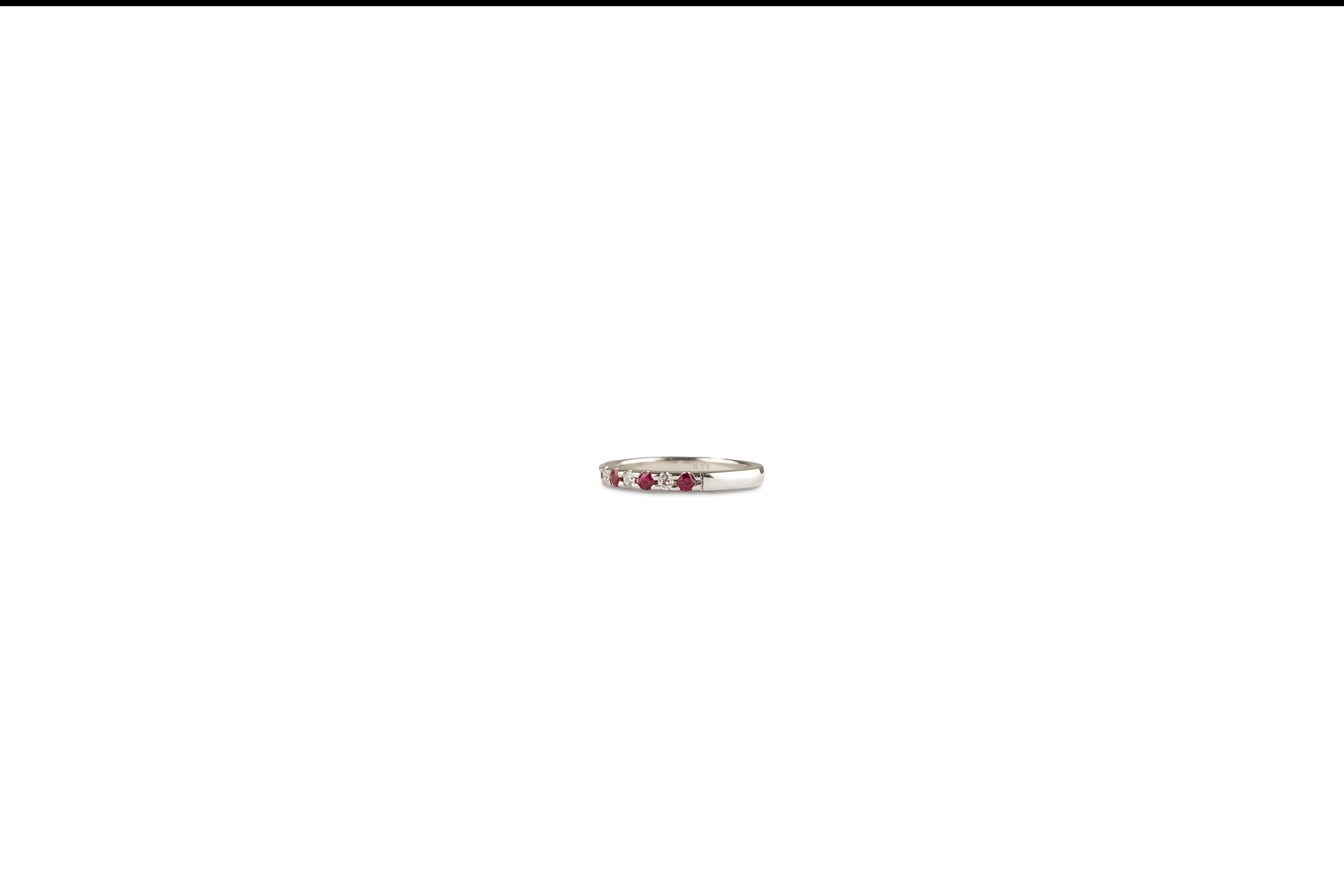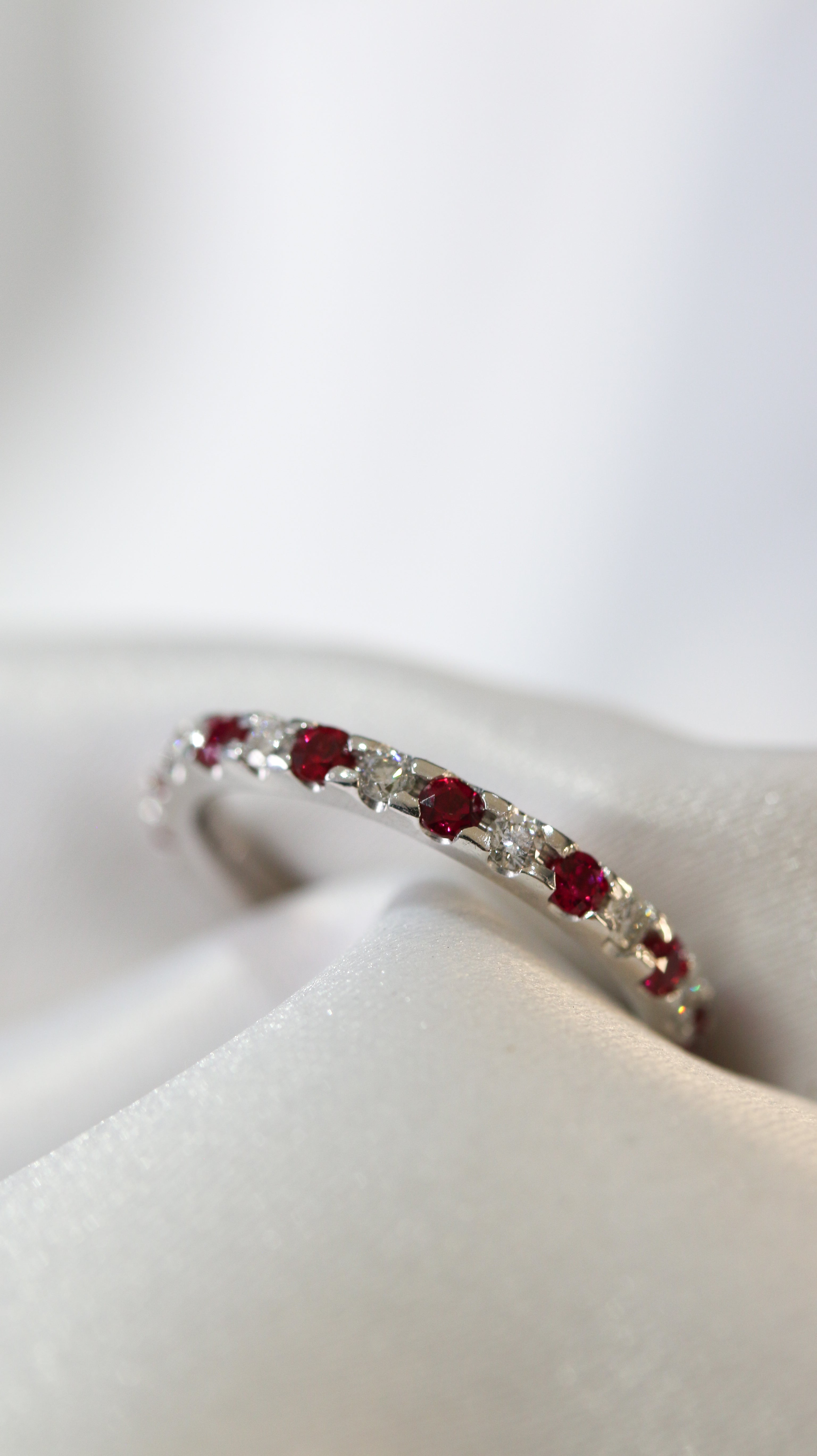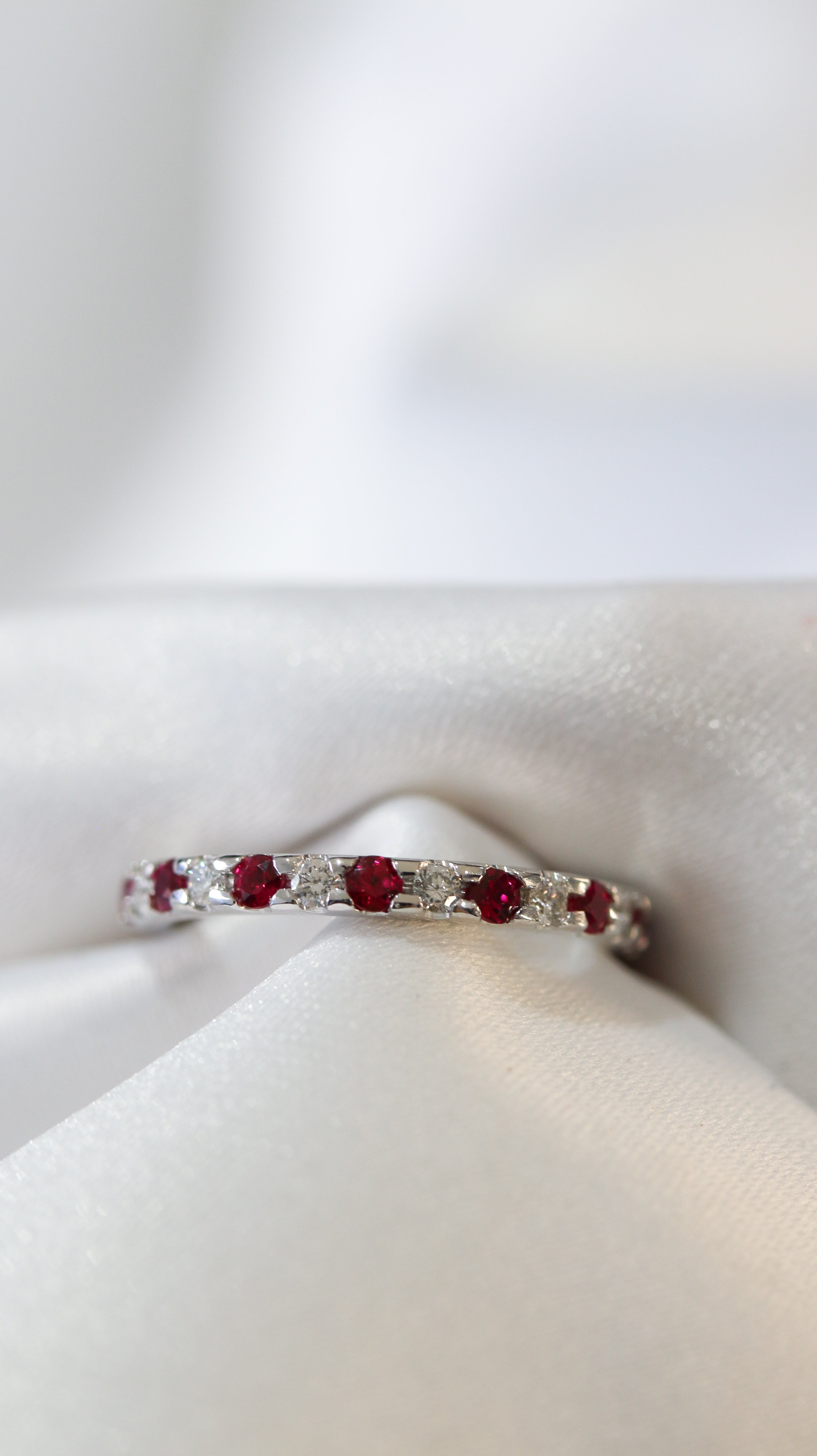 Churumbela de oro blanco 14K con 7 diamantes (0.21 ct total) y 8 rubíes (0.24 ct total) intercalados.