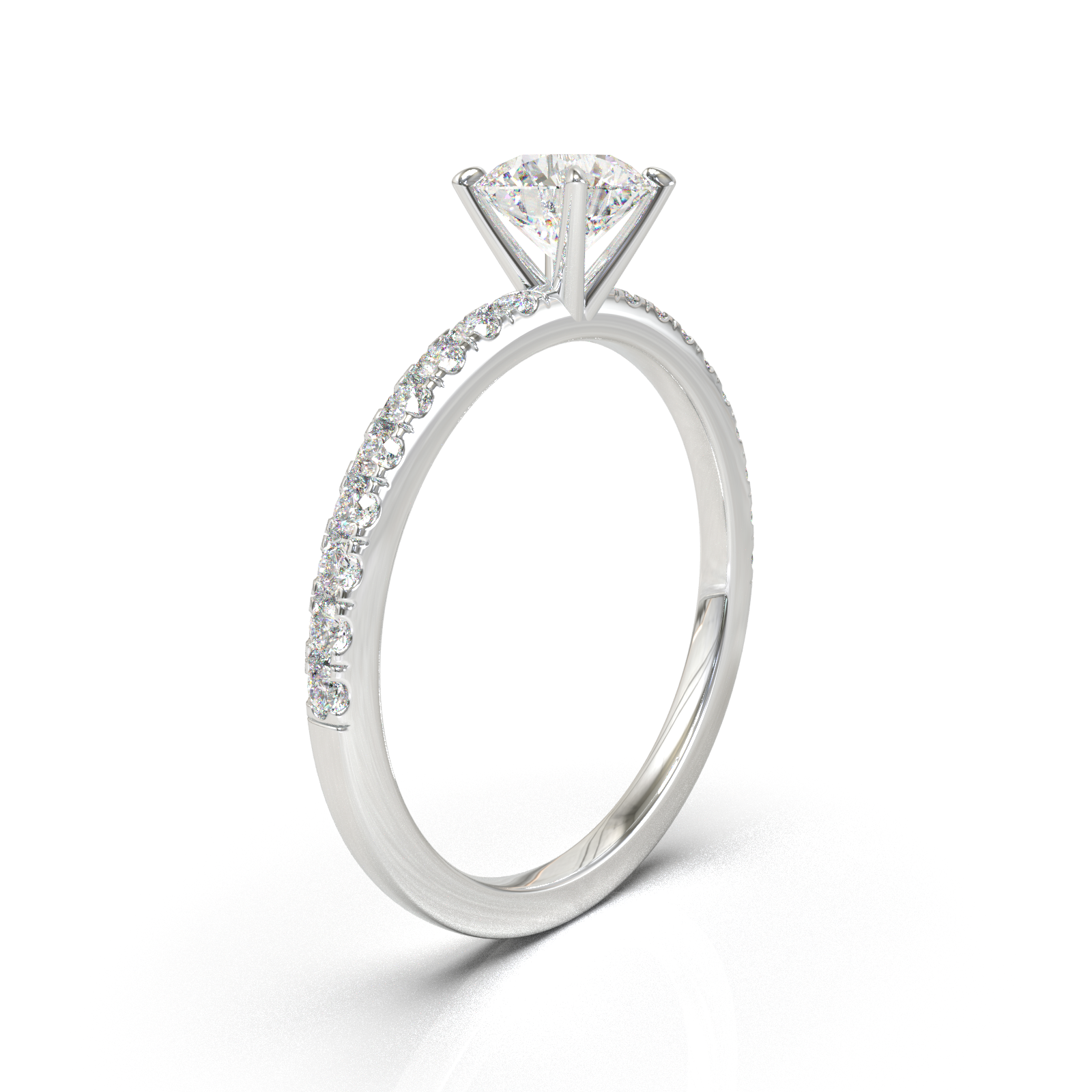 El anillo de compromiso que grita brillo en todo su esplendor. Los anillos con pavé se caracterizan por tener una banda engastada con una serie de diamantes colocada a lo largo del riel del anillo que acompañan al diamante central.