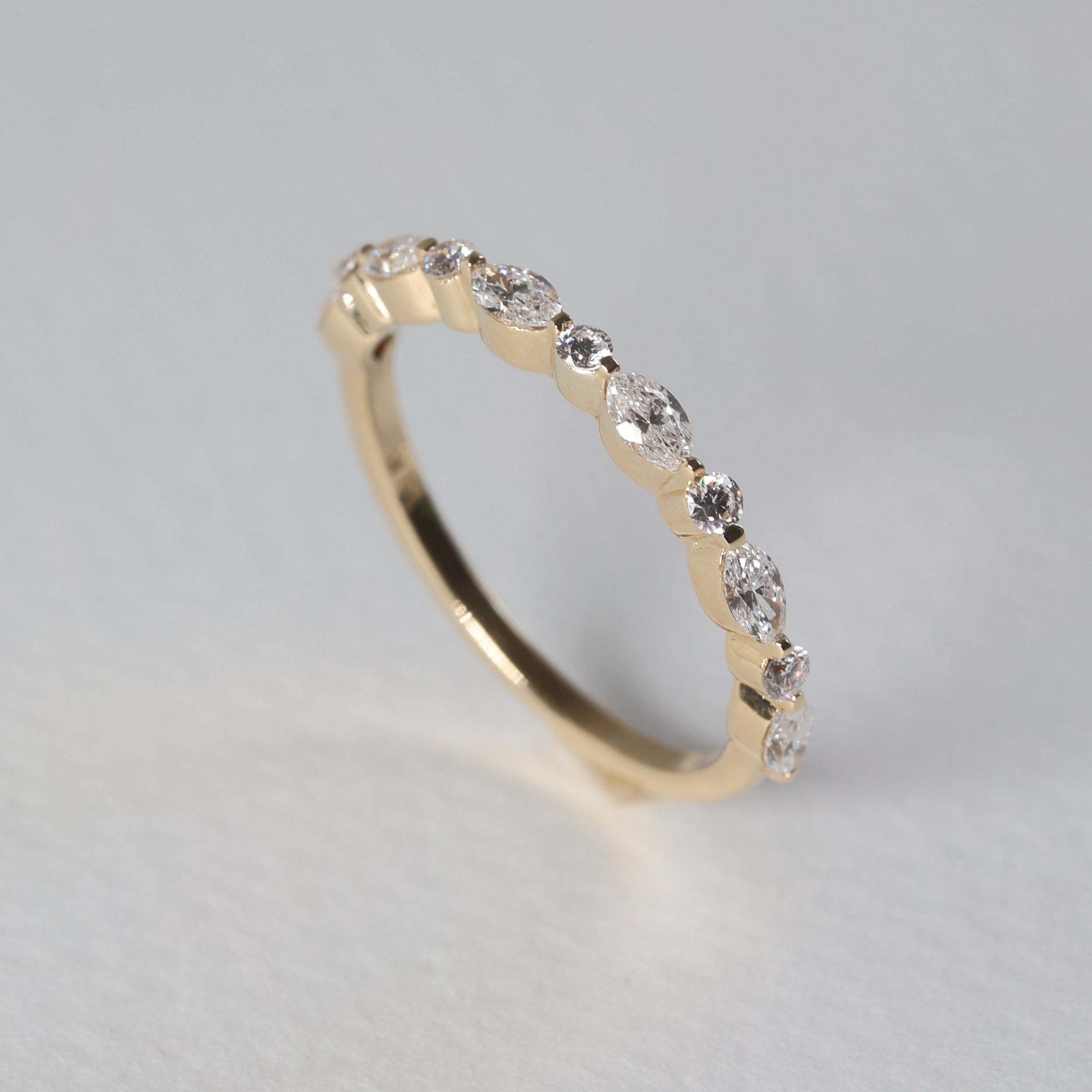 Churumbela de oro 14k que combina la elegancia clásica con un diseño contemporáneo. Presenta diamantes corte marquise alternados con brillantes redondos, creando un patrón visual dinámico que captura la luz desde múltiples ángulos.