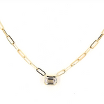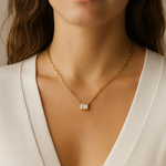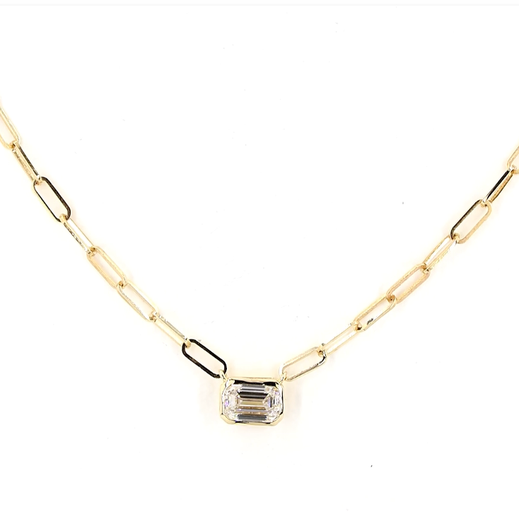 Un diseño de elegancia contemporánea. Este collar de oro amarillo de 14k enmarca un diamante esmeralda lab grown en un delicado engaste a bisel que realza su brillo limpio y eterno. La cadena estilo paper clip aporta un toque moderno y sofisticado, creando una pieza que equilibra fuerza y sutileza en cada detalle.