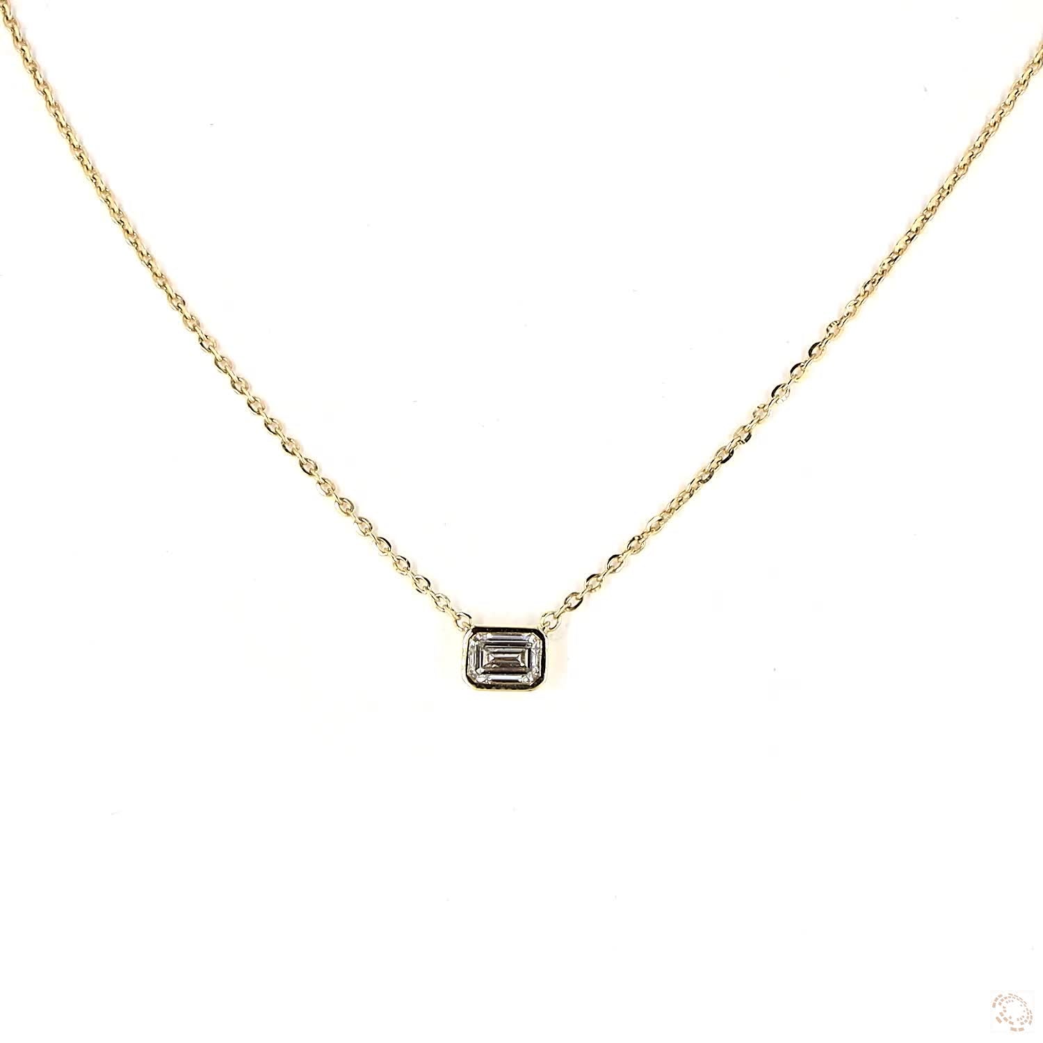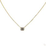 Un diseño de elegancia contemporánea. Este collar de oro amarillo de 14k enmarca un diamante esmeralda lab grown en un delicado engaste a bisel que realza su brillo limpio y eterno. La cadena estilo paper clip aporta un toque moderno y sofisticado, creando una pieza que equilibra fuerza y sutileza en cada detalle.