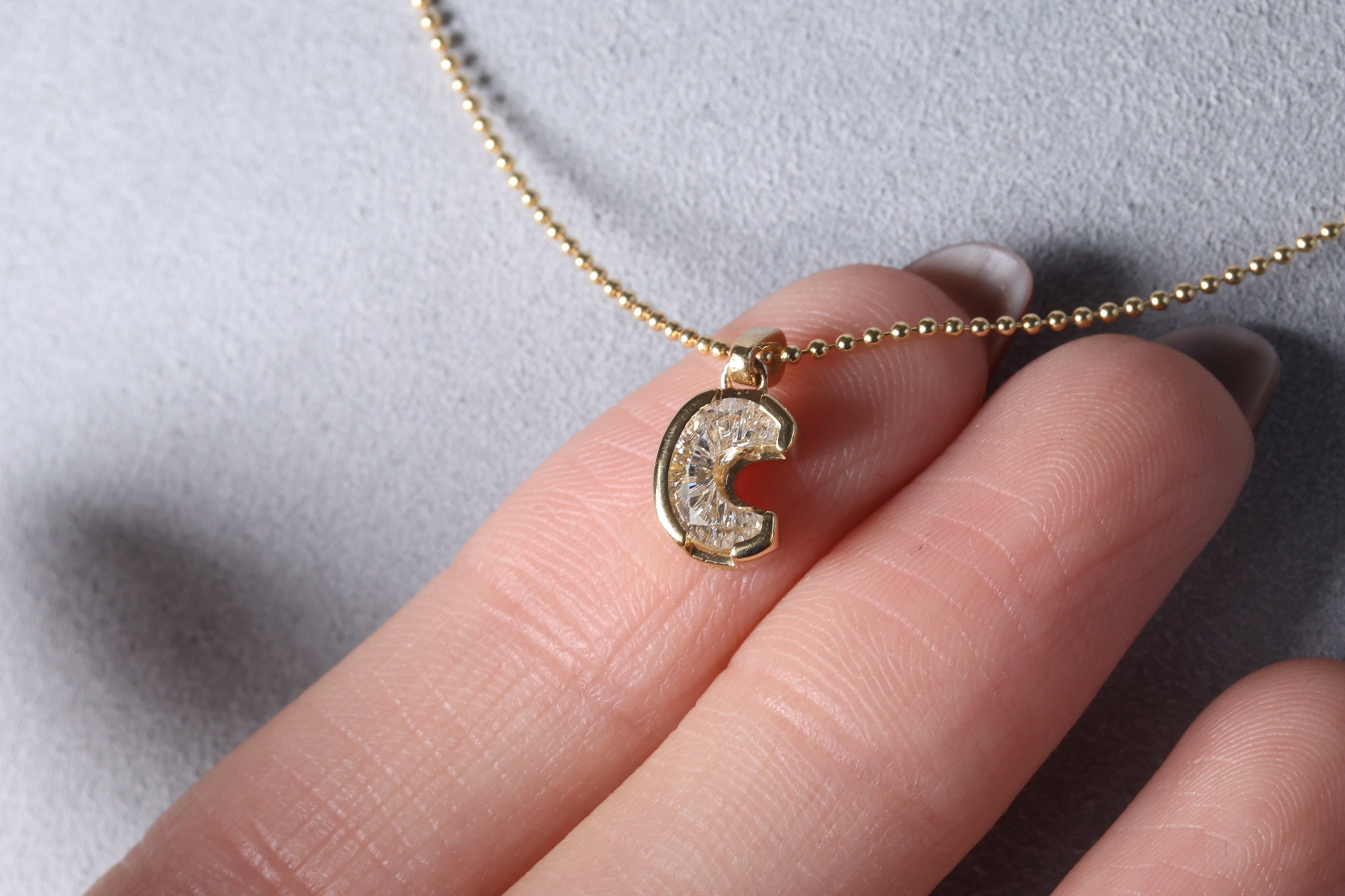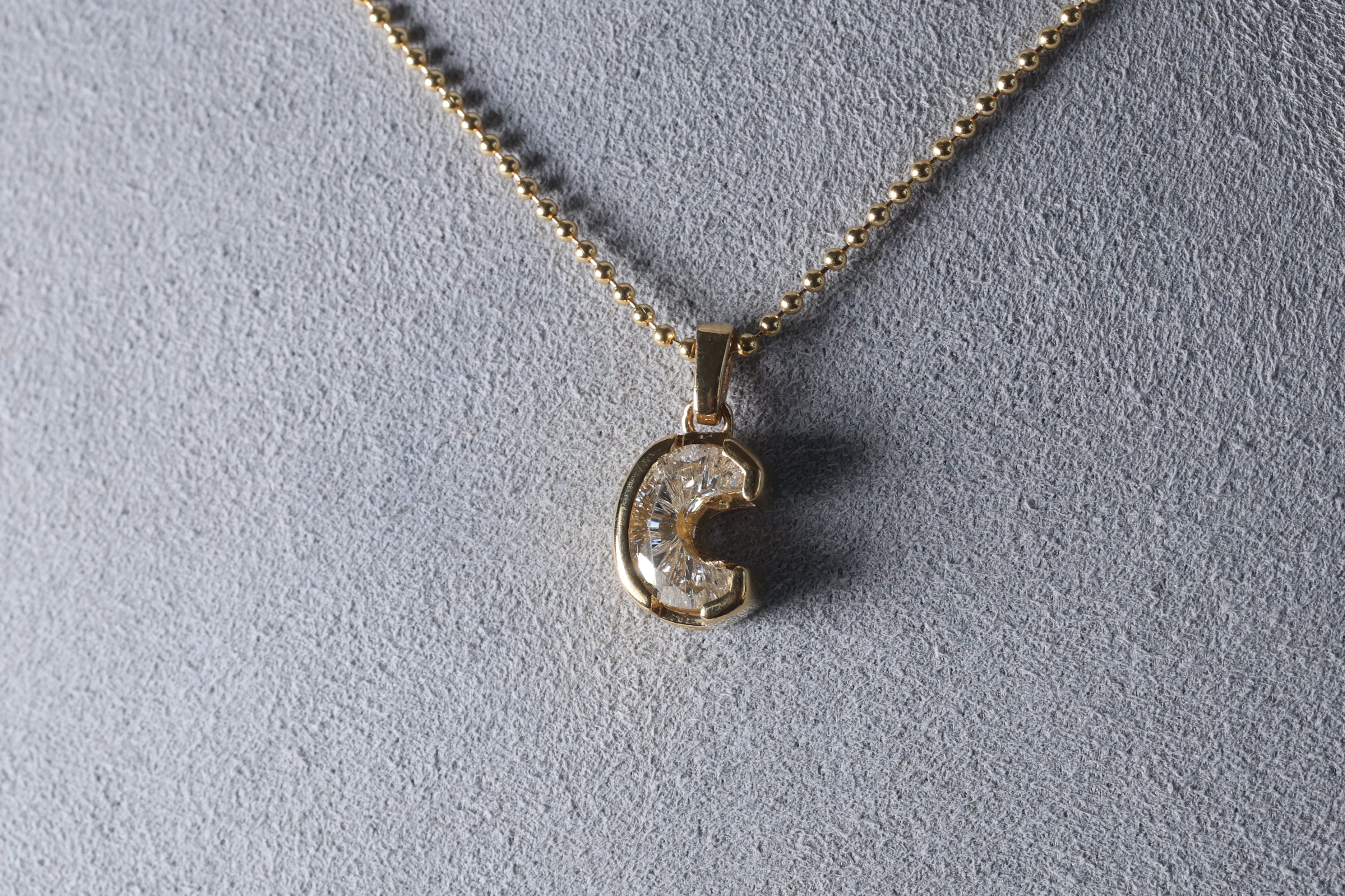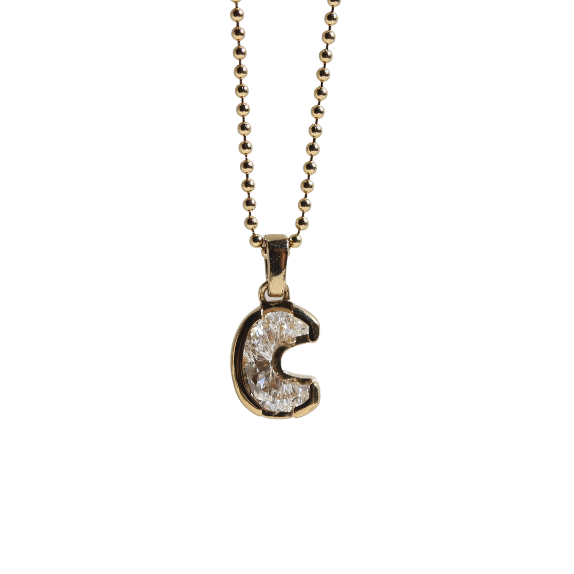 Dije de un solo diamante (single cut) Lab Grown de letra "C" en Oro Amarillo 18k