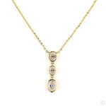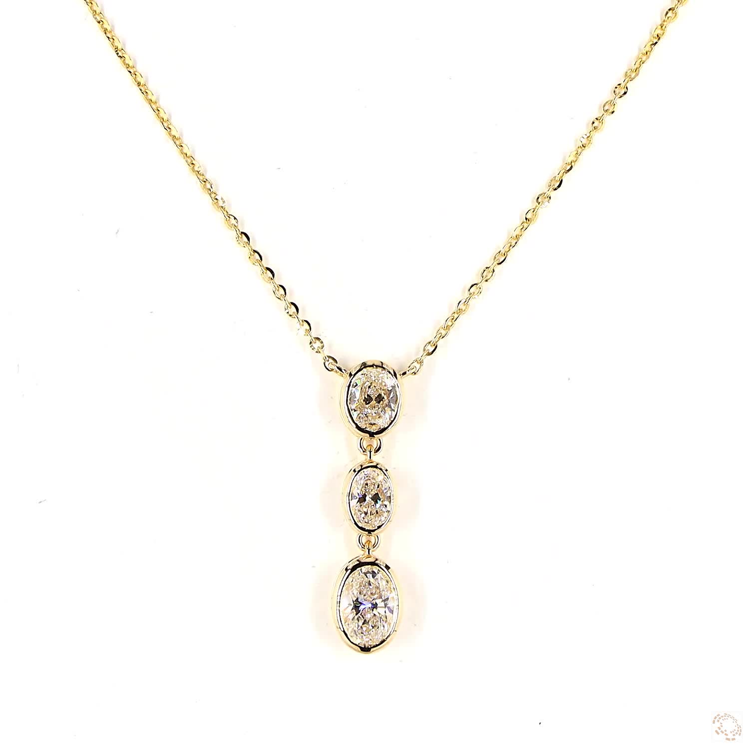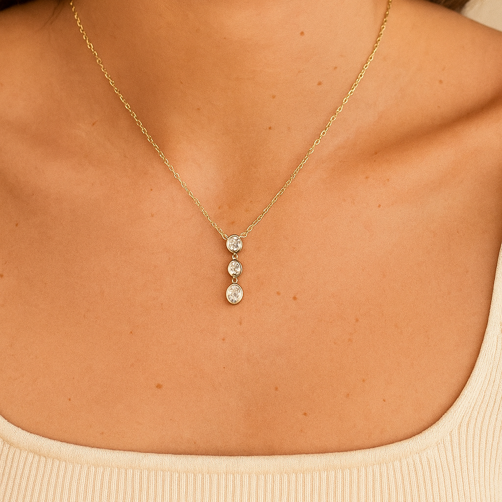 Collar con tres diamantes lab grown corte oval caen delicadamente en un montaje a bisel, creando un juego de luz y movimiento que captura la mirada. La cadena ancla en oro amarillo 14k aporta un toque contemporáneo, convirtiendo este collar en una pieza de elegancia fluida y atemporal.