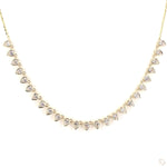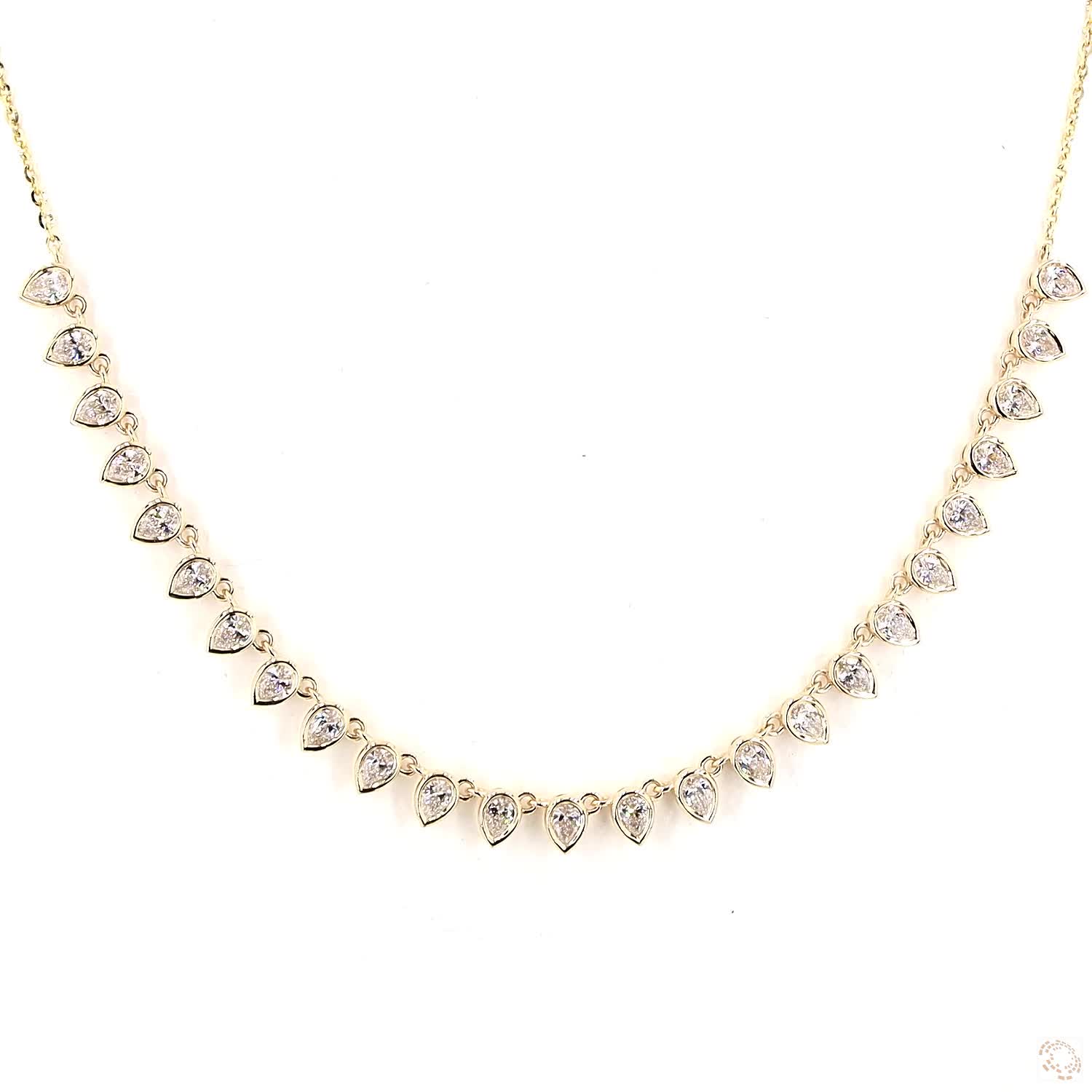 Collar con diamantes lab grown corte pera, montados a bisel en una delicada cadena estilo ancla en oro amarillo 14k, que capturan la luz con un brillo elegante y sutil. Su diseño moderno y atemporal combina sofisticación y ligereza, convirtiendo esta pieza en un accesorio que realza cada movimiento con gracia y delicadeza.