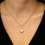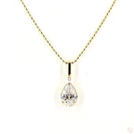 Un diamante lab grown corte pera, elegantemente montado a bisel con uñas, refleja la luz con un brillo delicado y sofisticado. La cadena ball chain en oro amarillo 14k añade un toque moderno y sutil, transformando este collar en un símbolo de elegancia atemporal.