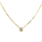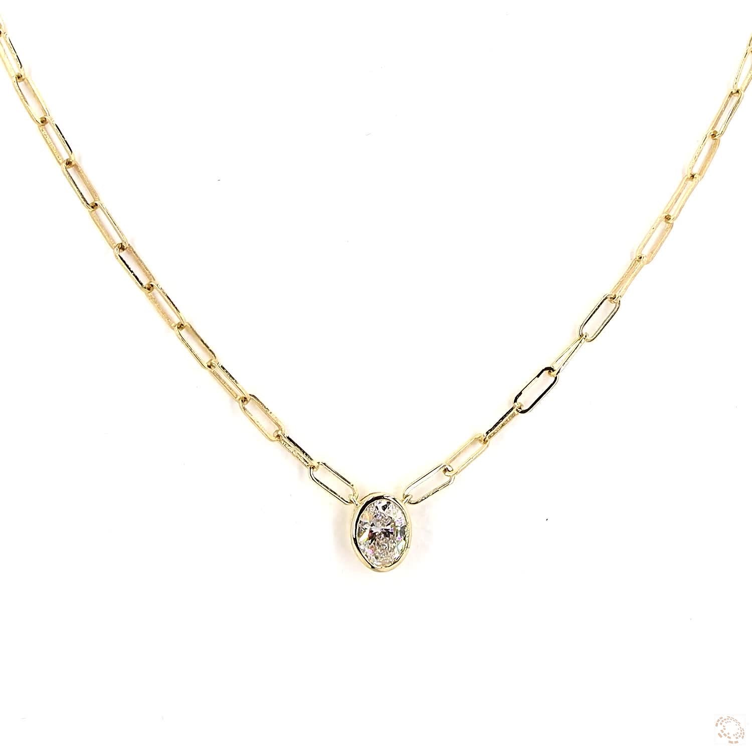 Sutil y refinado, este collar de oro amarillo de 14k enmarca un diamante lab grown corte oval que irradia una luz suave y envolvente. La cadena paper clip aporta un contraste moderno, creando una pieza de elegancia natural y encanto atemporal.