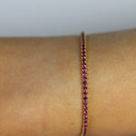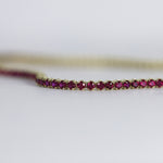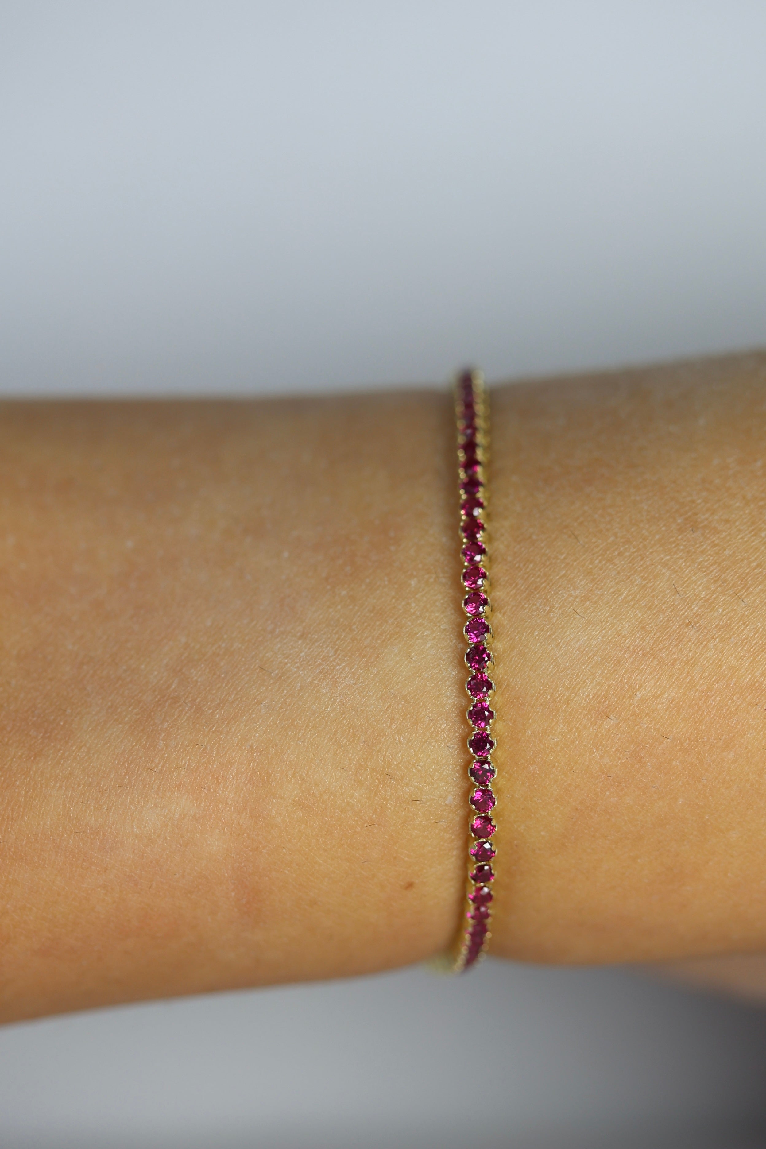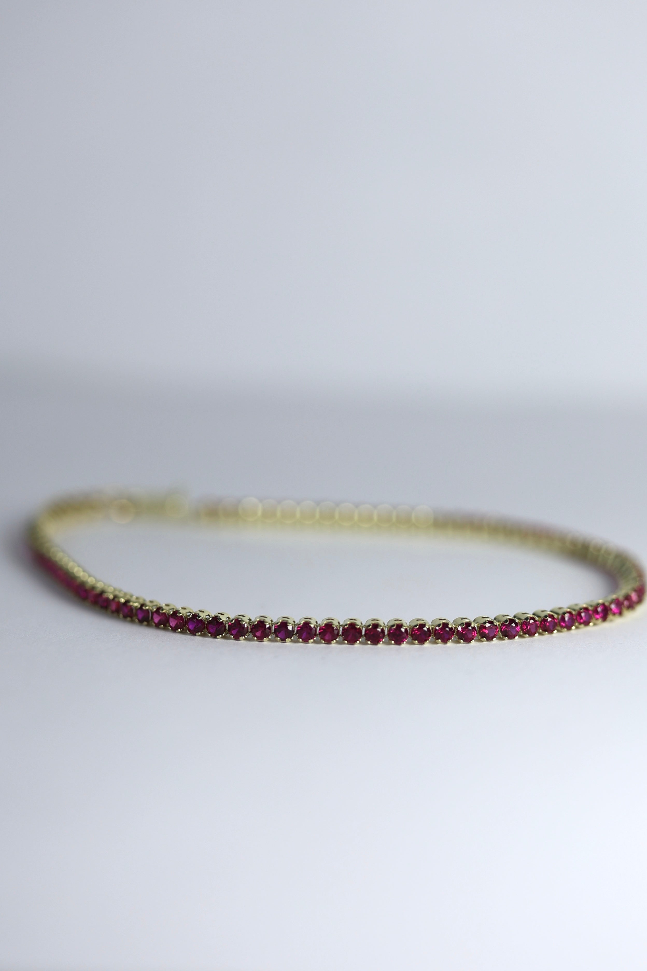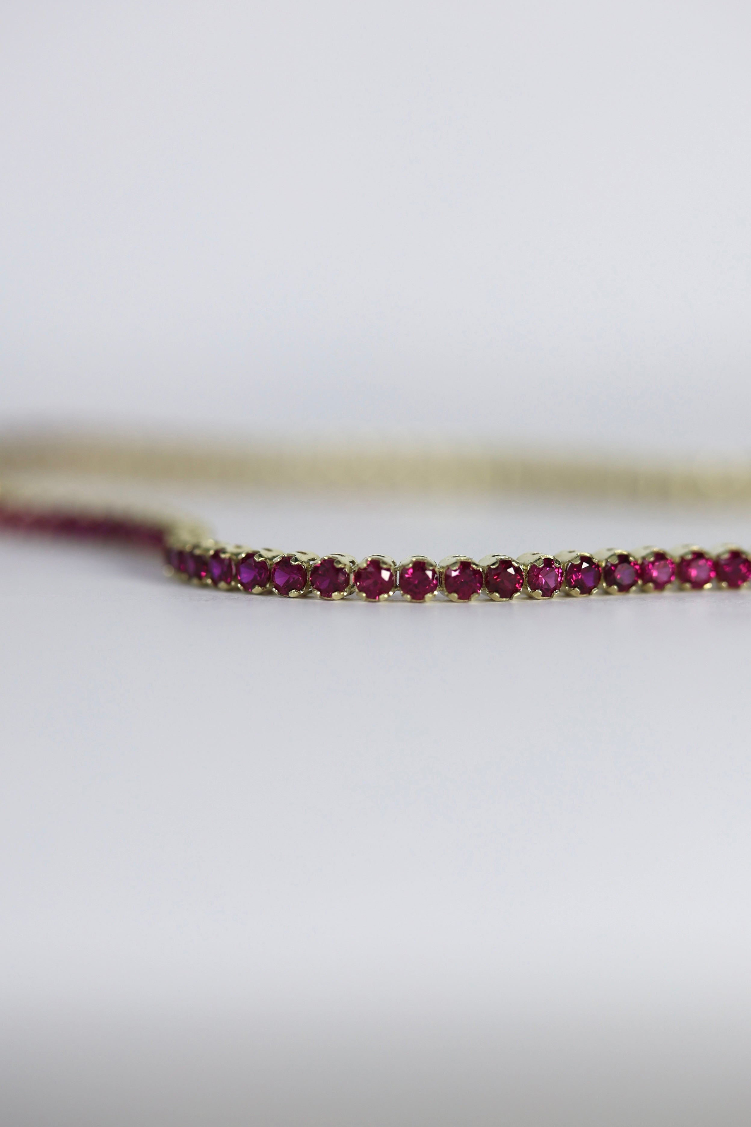 Un clásico reinventado con el color de la pasión. Este elegante tennis bracelet está elaborado en oro amarillo de 14k, realzando la calidez de sus rubíes naturales con un brillo atemporal.